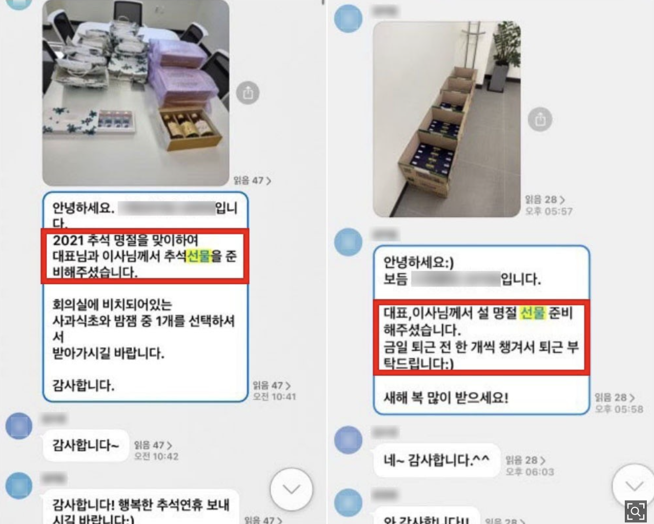 ① 스팸 : 강형욱은 명절 때, 직원들에게 보낸 문자를 공개했습니다. "사과 식초와 밤잼 중에 1개를 선택하셔서 받아 가시길 바랍니다." (2021년 추석) 강형욱에 따르면, 식초와 잼은 인기가 없었고, 수잔(강형욱 아내) 이사가 직원들에게 의견을 구해서, '스팸'이라는 답을 받았다고 합니다. 그렇게 명절 선물로 스팸을 주문했습니다. 하지만, 주문 실수로 스팸 6개 들이 제품을 박스채로 다량 주문한 것. "명절이 코앞이라 교환이 불가능했어요. 어쩔 수 없이 상황을 설명하고, 스팸을 쌓아 뒀습니다. 그중에 일부 직원은 배변 봉투에 (스팸을) 담았나 봐요. 저는 보지 못했지만... 그 이후로, 그런 실수는 없었습니다." 강형욱은 "더 이상 실수를 반복하지 않았다"고 해명했습니다. 이어, 명절 선물로 포장된 스팸 세트 사진을 추가로 제공했습니다.