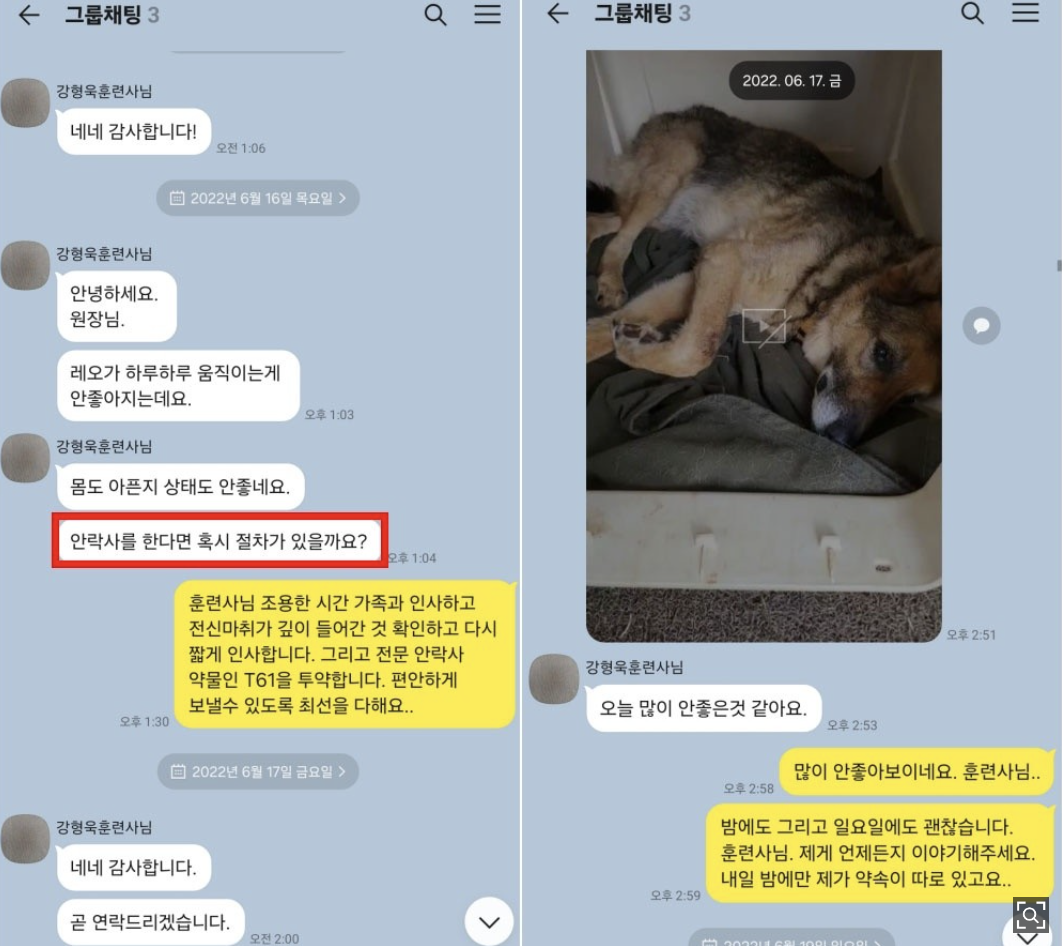 ③ 안락사 : 강형욱은 2022년 6월부터 안락사를 고민했었습니다. 다음은, 담당 수의사가 '디스패치'에 전한 카톡입니다. 수의사 E씨는 "잘못 알려진 게 너무 많다"며 분통을 터트렸습니다. "6월에 처음으로 안락사 절차를 물어봤습니다. 그런데 3번 정도 취소를 했어요. '저 못하겠어요. 조금 더 같이 있고 싶어요'라며 미뤘습니다. 저는 '언제든 마음 잡히면 이야기하라'고 말했고요." 그리고 2022년 11월 1일, "이제 레오를 보내줘야 할 것 같다"는 연락을 받았다고 밝혔습니다. "대형견은 뒷다리를 못쓰면 살이 빠집니다. 근육이 빠지면 좌골쪽 뼈가 튀어나와요. 그 부분 피부가 얇아져서 바닥에 쓸리면 거의 욕창이 생깁니다. 근데 좌골에 욕창 하나 없더라고요." (수의사)
