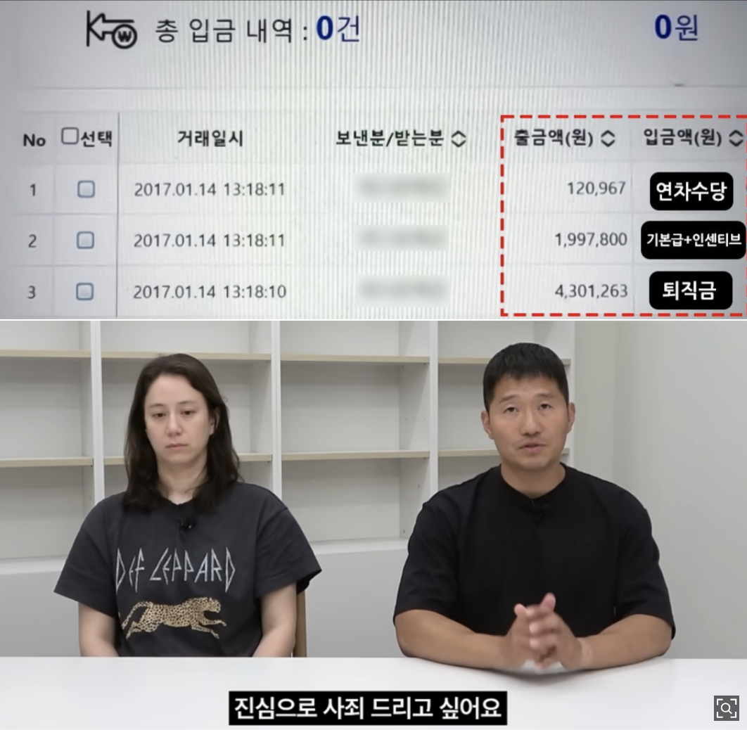 우선, 영업직 직원에게 보낸 9,670원에 대해선 사과했습니다. "가장 부끄러운 실수"라며 고개를 숙였고, 그 이후에 나머지 정산금을 지급했다고 덧붙였습니다. (강형욱이 보낸 돈은, 642만 30원이다. 기본급+인센 199만 7,800원, 연차수당 12만 967원, 퇴직금 430만 1,263원. 노동청 신고 이후에 지급됐다.)