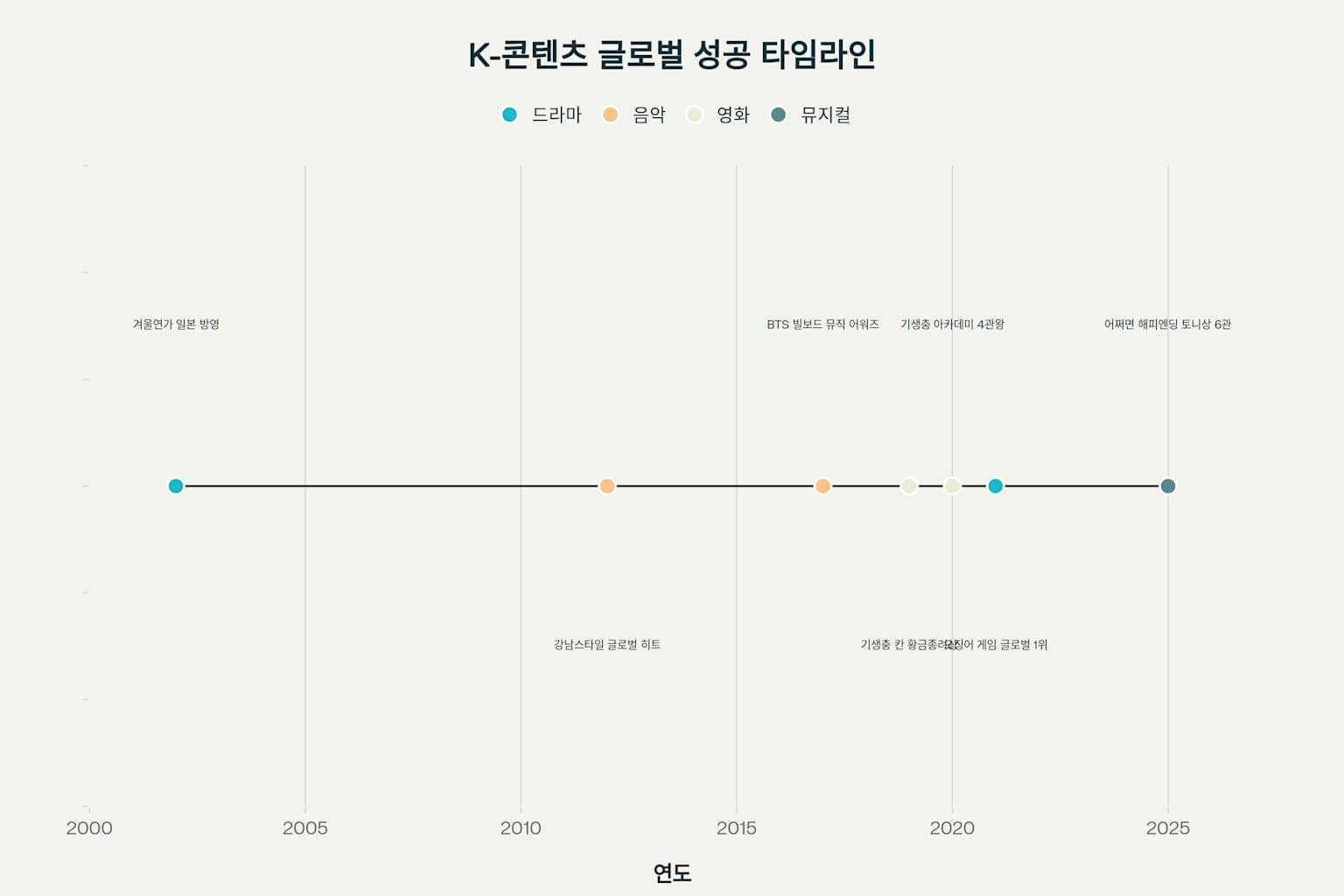 '어쩌면 해피엔딩'의 토니상 수상은 K-콘텐츠 글로벌 성공 스토리의 새로운 장을 연 사건입니다. 2002년 '겨울연가'로 시작된 1차 한류부터 최근 '오징어 게임'의 전 세계적 신드롬까지, 한국 콘텐츠는 꾸준히 세계 무대에서 인정받아왔습니다.