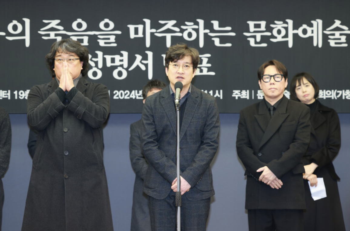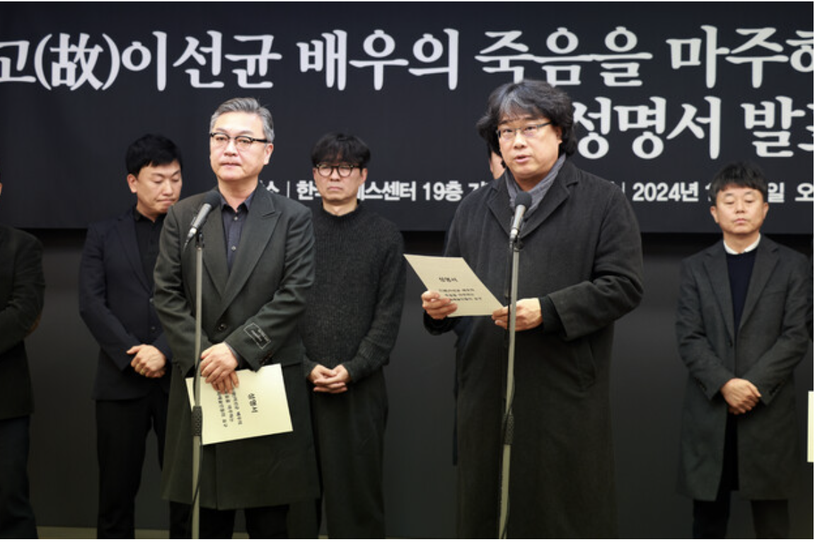 영화·방송·매니지먼트 관련 단체 29개가 참여한 문화예술인연대회의는 12일 서울 중구 프레스센터에서 기자회견을 열고, 배우 이선균의 죽음을 마주하는 문화예술인들의 요구’라는 제목의 성명을 발표했습니다. 배우 최덕문의 사회로 배우 김의성과 감독 봉준호, 가수 윤종신, 감독 이원태가 성명을 낭독하였고, 수사당국과 언론·미디어, 정부·국회를 향해 각각의 요구사항을 밝혔습니다.