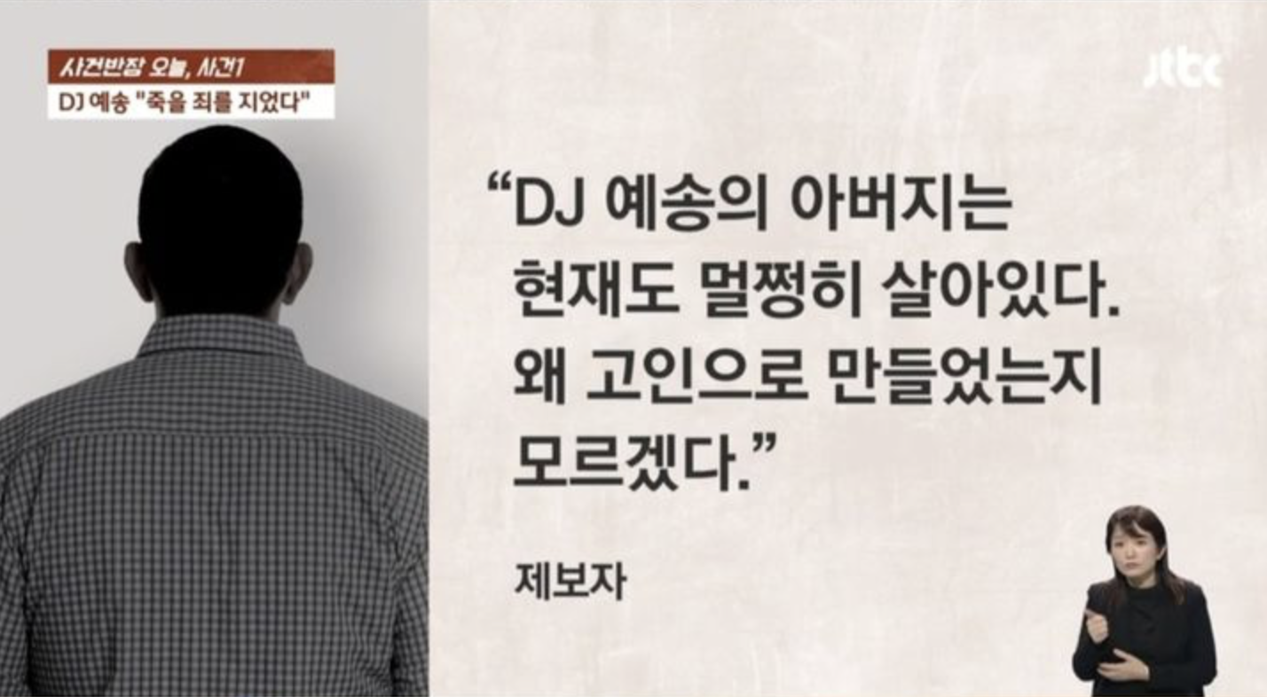 제보자는 "예송의 아버지는 현재 멀쩡히 살아있다"고 주장했고, "대체 왜 고인으로 만들었는지 모르겠다"고 덧붙였습니다. 이에대하 DJ예송 측은 제보자 주장이 '사실'이라고 밝혔습니다. 그러면서 '딸의 입장을 모친의 입으로 전하다 보니 오해가 생긴 것'이라는 어처구니가 없는 말로 해명을 했습니다.