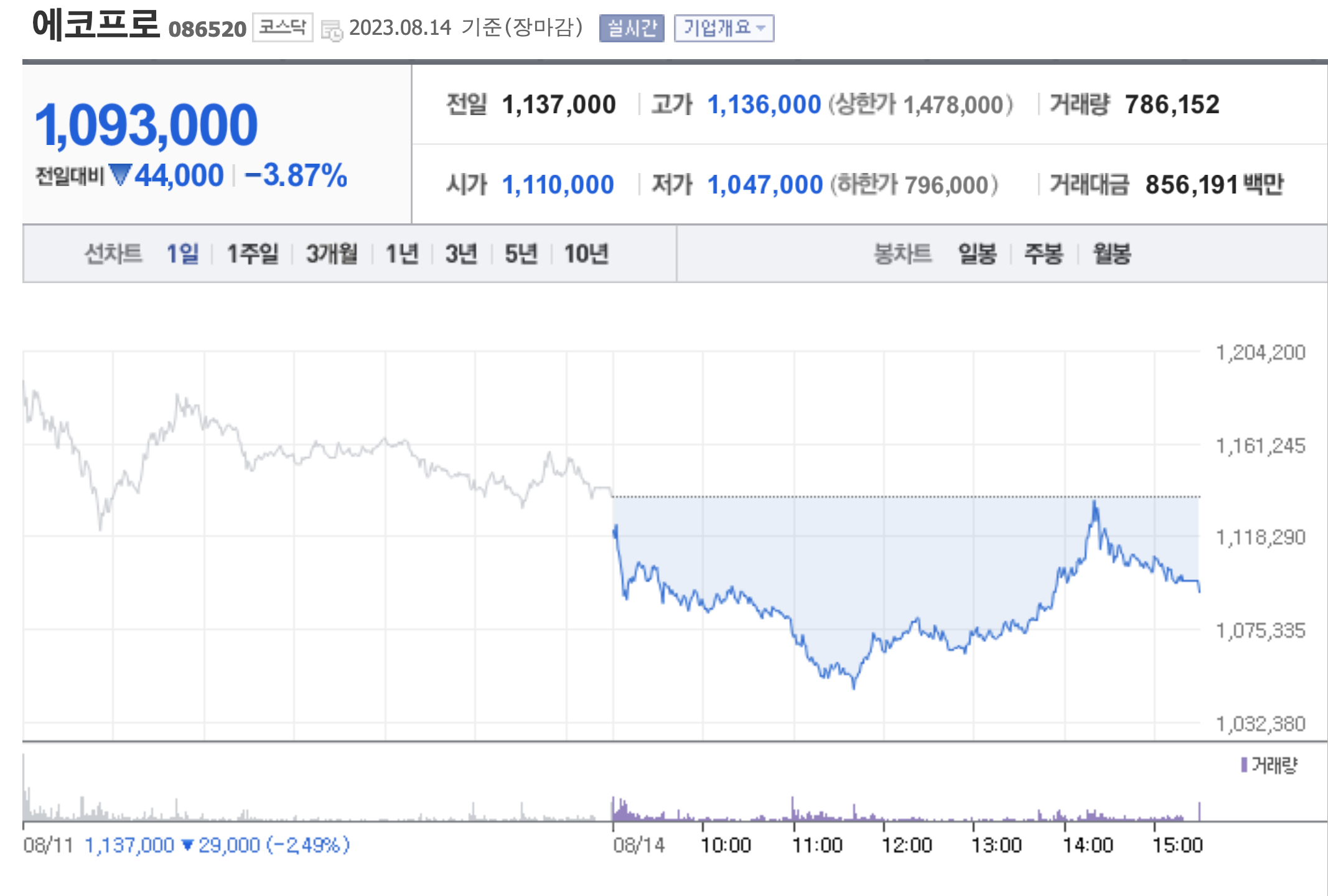 에코프로가 모건스탠리캐피털인터내셔널(MSCI) 한국 지수 구성 종목으로 편입됐음에도 불구하고, 그 주가는 연일 하락세를 보이고 있습니다. 현재 코스닥시장에서 에코프로 주식은 전 거래일 대비 3.87% 하락한 109만3천원에 거래되고 있으며, 이는 지난 11일 이후 2일 연속 내림세입니다.