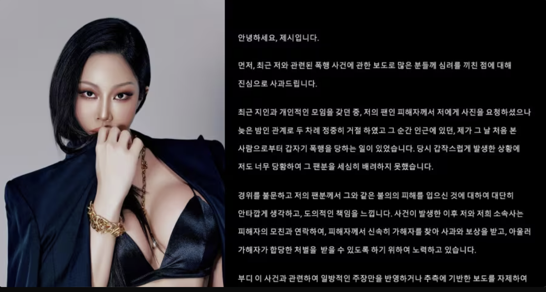 논란이 커지자 제시는 결국 SNS를 통해 공식 사과문을 발표했습니다. 주요 내용은 다음과 같습니다:
