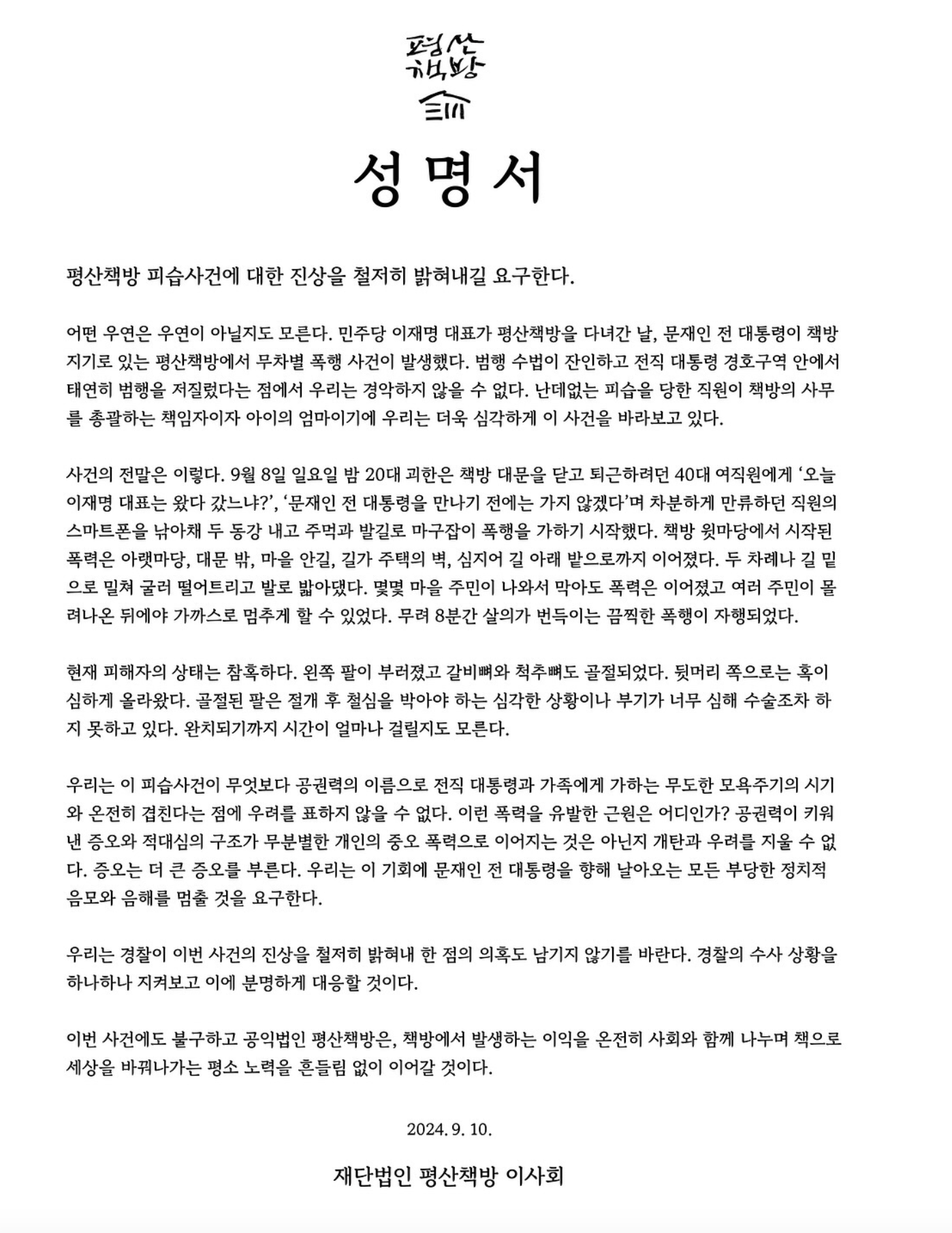 평산책방은 이날 페이스북 계정에 이사회 명의로 성명을 올려 "9월 8일 일요일 밤 20대 괴한은 책방 대문을 닫고 퇴근하려던 40대 여직원에게 '오늘 이재명 대표는 왔다 갔느냐?', '문 전 대통령을 만나기 전에는 가지 않겠다'며 직원의 스마트폰을 낚아채 두 동강 내고 주먹과 발길로 마구잡이 폭행을 가하기 시작했다"고 밝혔습니다.
